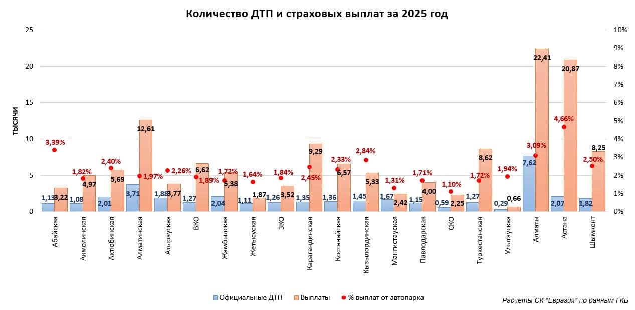 «Наибольшее расхождение зафиксировано в Астане – там страховых выплат в 10 раз больше, чем официальных ДТП. Это говорит о том, что столица – город «мелких коцак» и притирок, в то время как в регионах, например, в Мангистауской области, аварии чаще носят тяжелый характер», — отмечают аналитики.