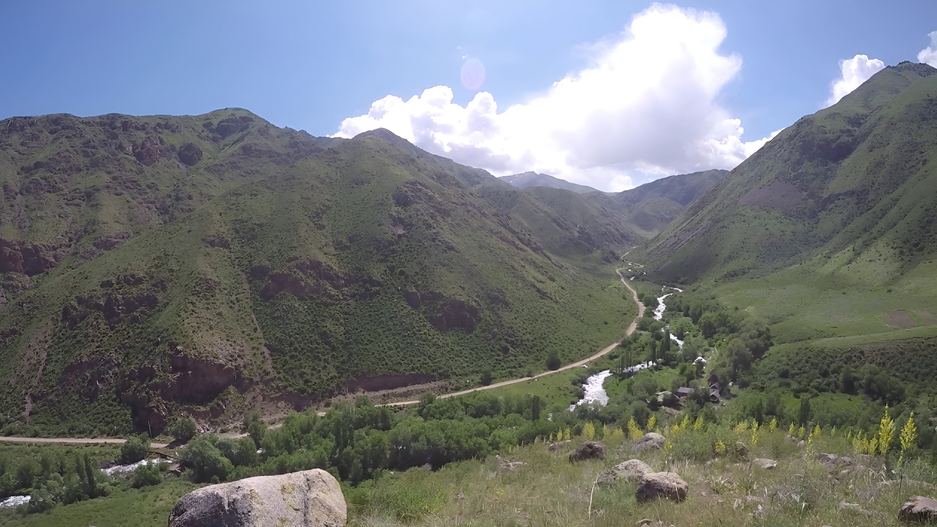После Мерке маршрут уходит в сторону гор, в ущелье и вдоль долины реки. Сначала дорога относительно нормальная, но чем выше поднимаешься, тем сложнее становится покрытие. Последние примерно 30 километров начинается грунтовка и местами полноценное бездорожье.