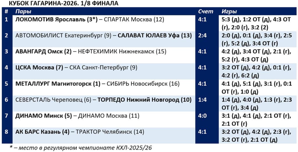 После завершения первого раунда плей-офф Континентальной хоккейной лиги-2026 стали известны четвертьфинальные пары Кубка Гагарина.