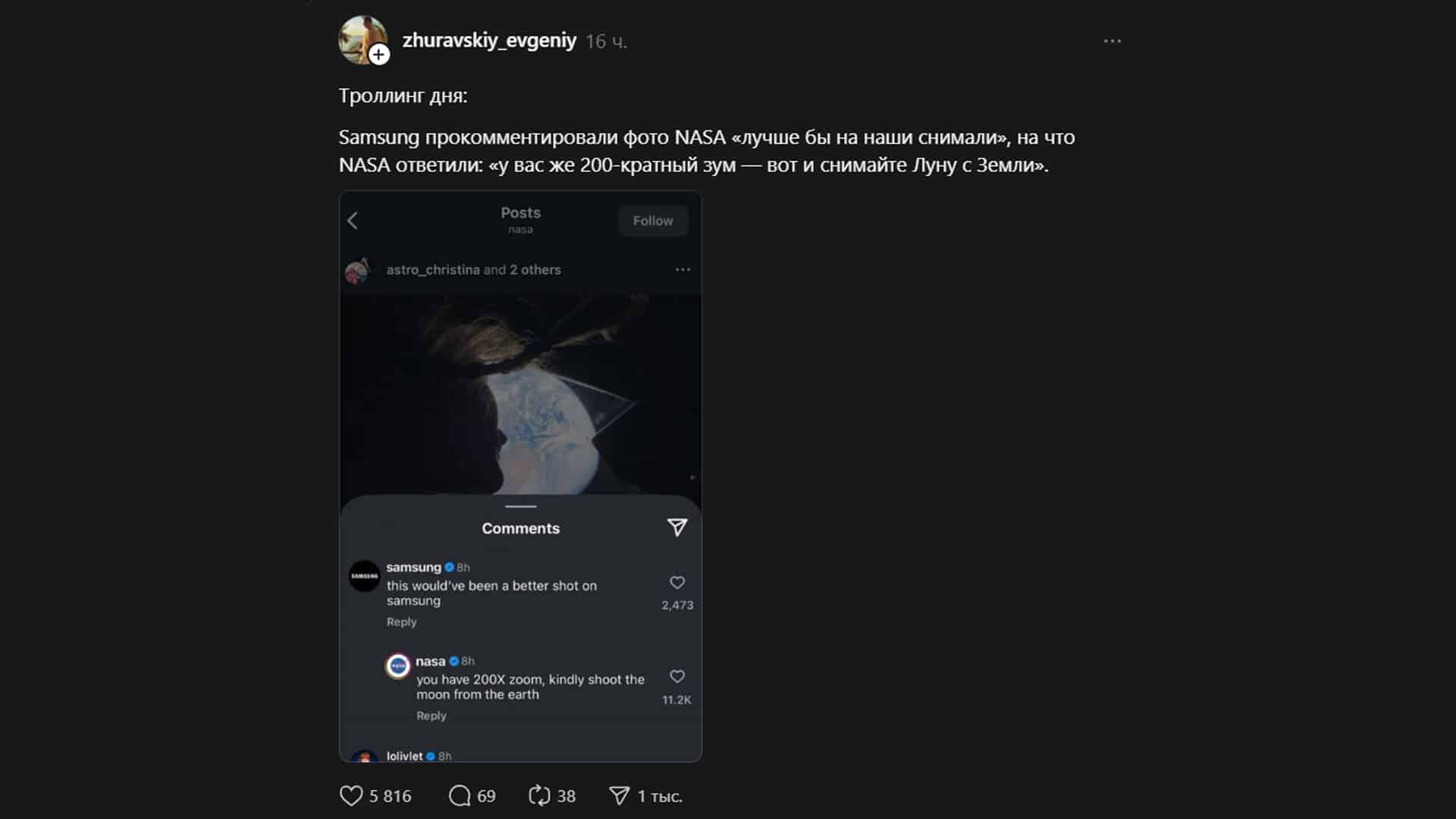 Официальный аккаунт Samsung не удержался и вставил свои «пять копеек» под постом NASA и заметил, что на их флагманы снимки получились бы лучше. Ответ агентства мгновенно разлетелся на мемы.