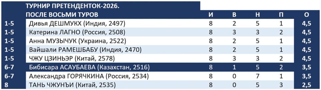 После восьмого тура в женской части турнира не осталось шахматисток без потерь. Первые фиаско потерпели Анна Музычук с Украины и россиянка Александра Горячкина. Теперь лидеров сразу пятеро, а Асаубаева с Горячкиной отстают от них всего на один балл.