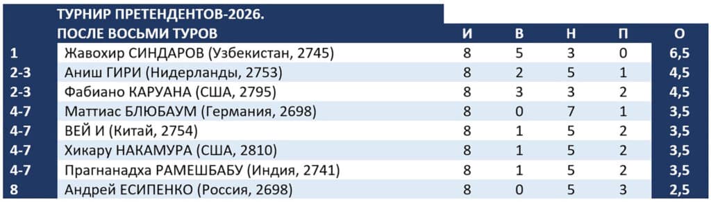 В мужском турнире лидер еще более упрочил позиции. 20-летний Жавохир Синдаров из Узбекистана, сыграв вничью с россиянином Андреем Есипенко, на два очка опережает ближайших преследователей.