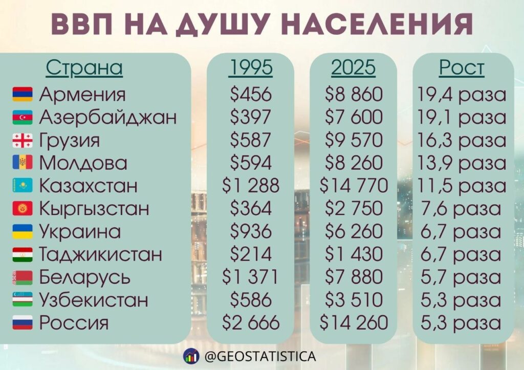 С 1995 года ВВП на душу населения в Казахстане вырос в 11,5 раза (с $1 288 до $14 770). Несмотря на значительный абсолютный прирост, по темпам динамики лидерство удерживают страны Закавказья. Так, Армения увеличила показатель в 19,4 раза, Азербайджан — в 19,1 раза, а Грузия — в 16,3 раза.