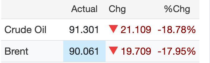 По данным торгов, нефть марки WTI crude oil подешевела уже на 18,8% — до $91,30 за баррель. Brent crude oil также резко просела — на 18%, опустившись до $90,06.