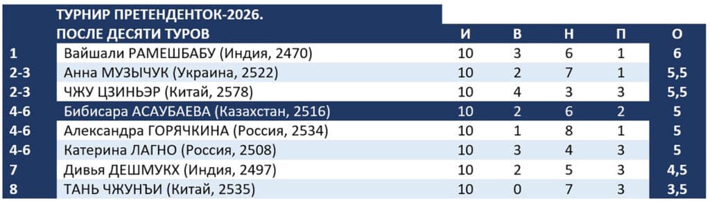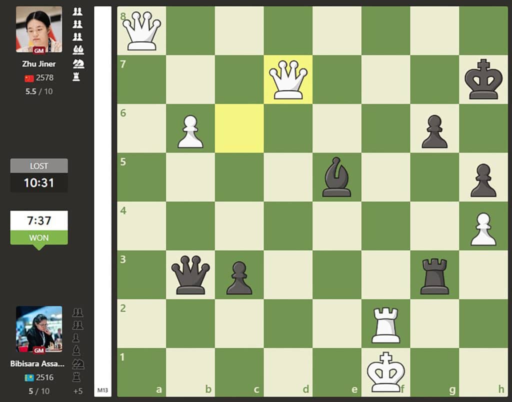 Отступать Асаубаевой было некуда. После четвертого тура трехкратная чемпионка мира по блицу лидировала, но серия из двух поражений и трех ничьих отбросила ее на предпоследнее место. Повторно победив Чжу Цзиньэр, Асаубаева подтянулась к лидерам. Вайшали Рамешбабу из Индии она теперь уступает один балл, побежденной китаянке и Анне Музычук с Украины – полпункта.