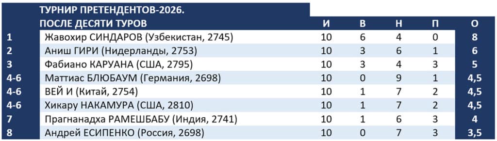 У мужчин все стабильно. Узбекистанец Жавохир Синдаров, одержав шестую победу, за четыре тура до финиша опережает ближайшего преследователя, Аниша Гири, на два очка. В 11-м туре ташкентец черными сыграет с американцем Фабиано Каруаной, а нидерландский уроженец Санкт-Петербурга белыми поспорит со своим экс-соотечественником Андреем Есипенко.