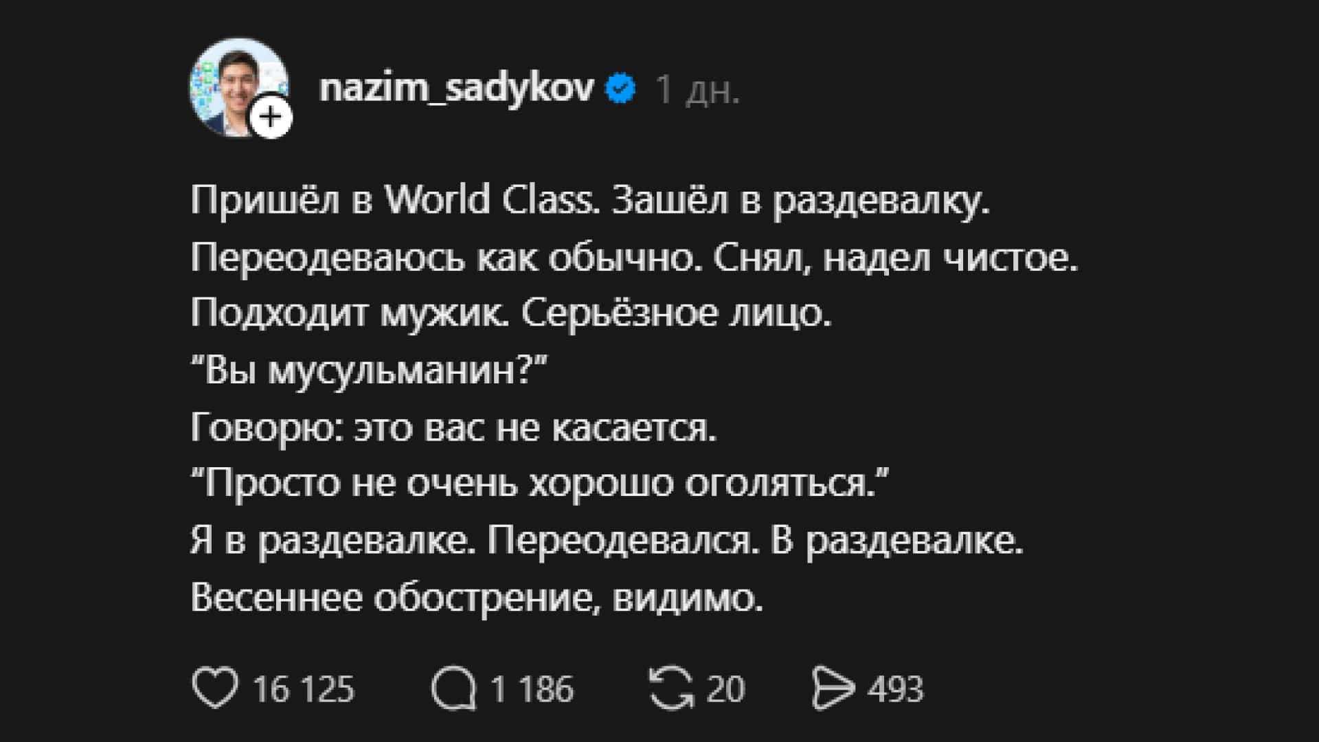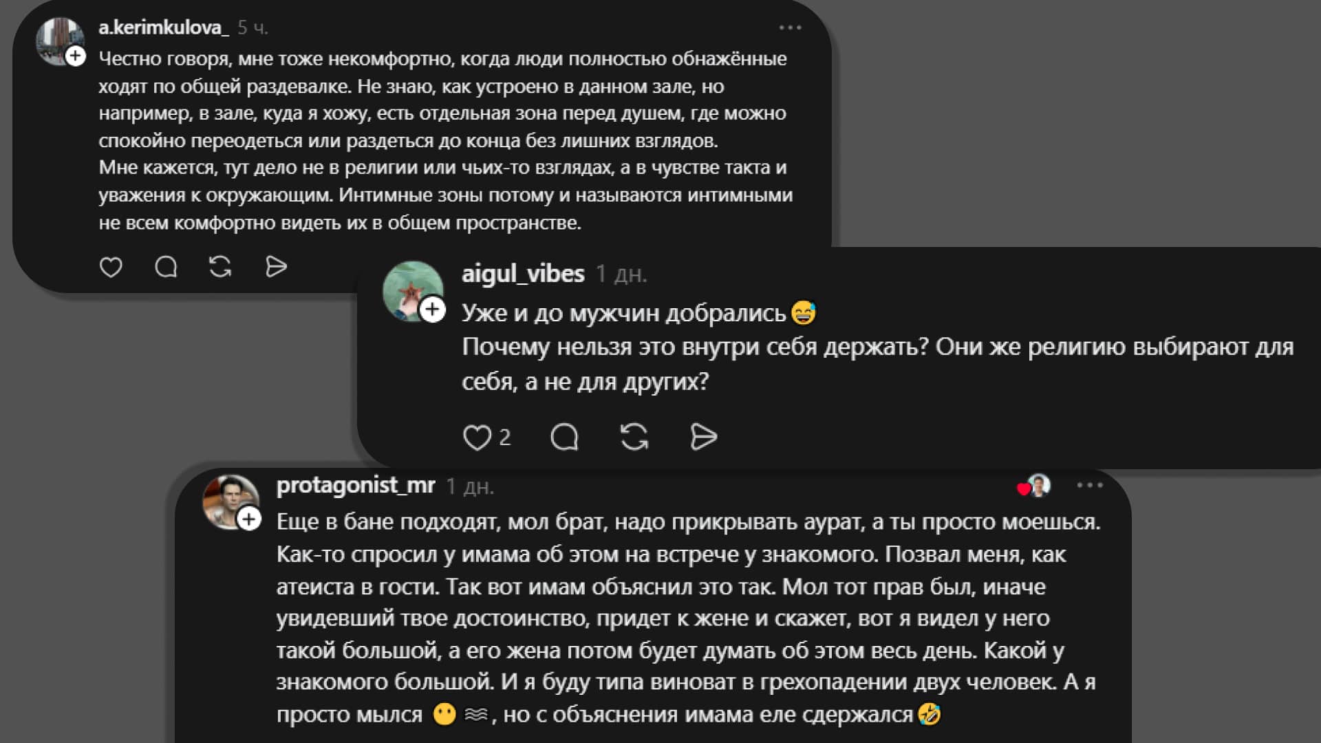В Threads разгорелась дискуссия после поста пользователя Назима Садыкова. Он рассказал, что столкнулся с неожиданным замечанием в раздевалке фитнес-клуба. Kursiv LifeStyle изучил онлайн-дискуссию и проконсультировался с психологами и представителем религии.