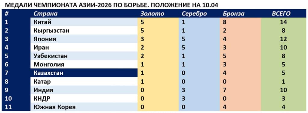 Единственное пока золото Казахстану принес борец греко-римского стиля Алматбек Аманбек, первенствовавший в весовой категории 72 кг. Бронзовые медали, помимо Еркебаевой, завоевали Нурсултан Турсынов (87 кг), Ибрагим Магомадов (82 кг) и Ислам Евлоев (97 кг).