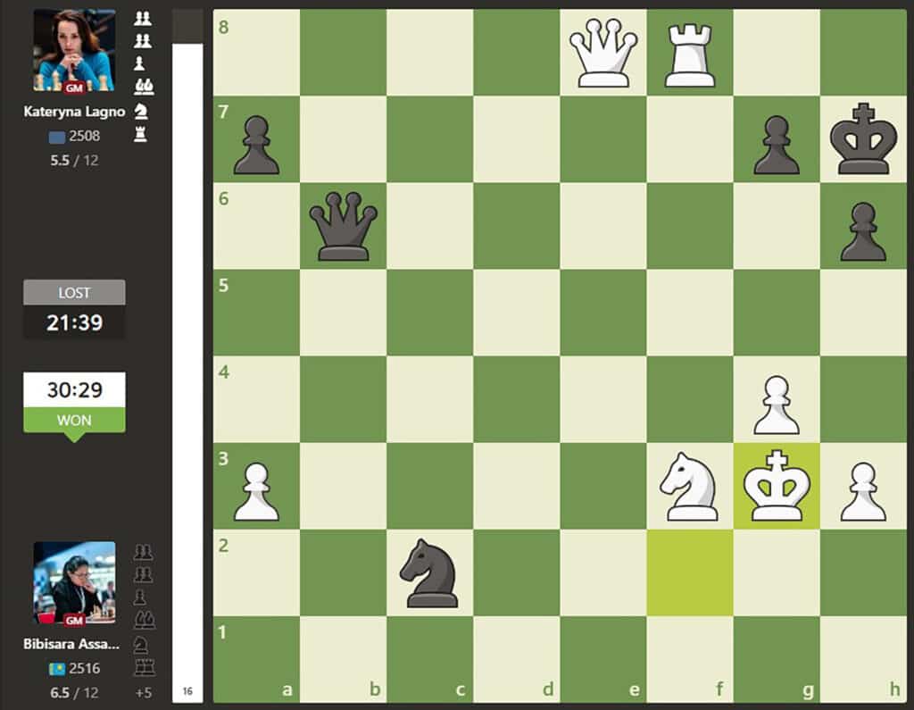 Казахстанский гроссмейстер Бибисара Асаубаева, пятая по рейтингу среди участниц турнира, остается в гонке за первое место. В 12-м туре наша шахматистка блестяще сыграла с россиянкой Лагно, перед угрозой матовой атаки заставив ее капитулировать на 49-м ходу (см. диаграмму). Реванш за фиаско в первой партии получился полноценным и очень своевременным.