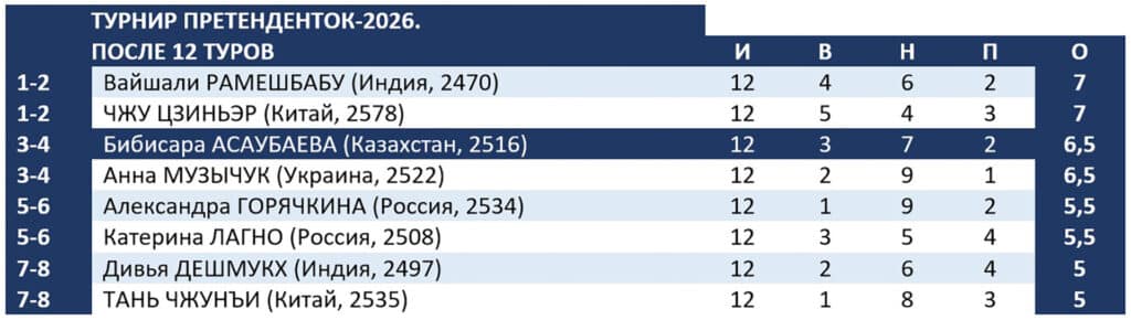 Рейтинговый фаворит Чжу Цзиньэр из Китая, победив черными Вайшали Рамешбабу, догнала индийскую шахматистку. Всего на пол-балла отстают от них Асаубаева и Анна Музычук с Украины, в отчетном туре доигравшаяся с россиянкой Александрой Горячкиной до голых королей.