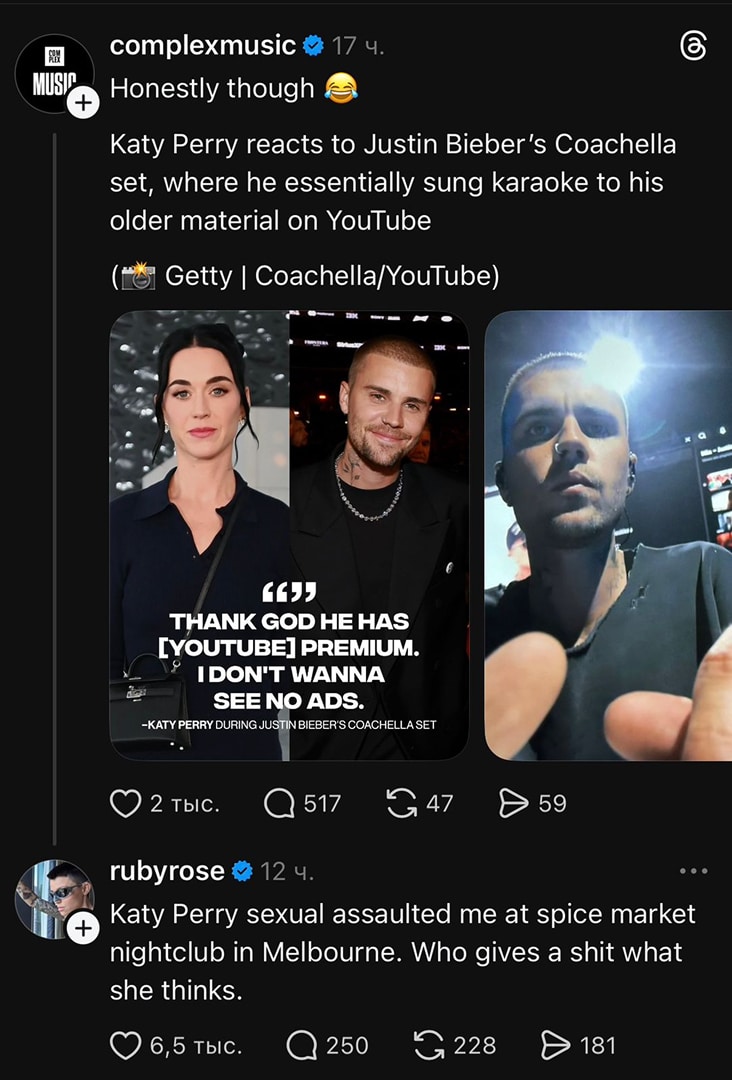Скандал начался с комментария Роуз в Threads под постом о фестивале Coachella. Она написала, что Перри якобы совершила насилие над ней в ночном клубе в Мельбурне.