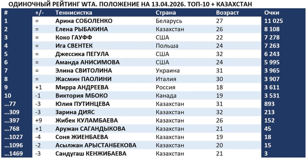 В топ-10 парного рейтинга изменений не произошло. Анна Данилина, в тандеме с Жибек Куламбаевой завоевавшая важное очко в матче с Канадой, по-прежнему седьмая. Однако в предстоящем турнире WTA-500 в Штутгарте ни она, ни ее постоянная партнерша Александра Крунич (8) из Сербии участия не примут.
