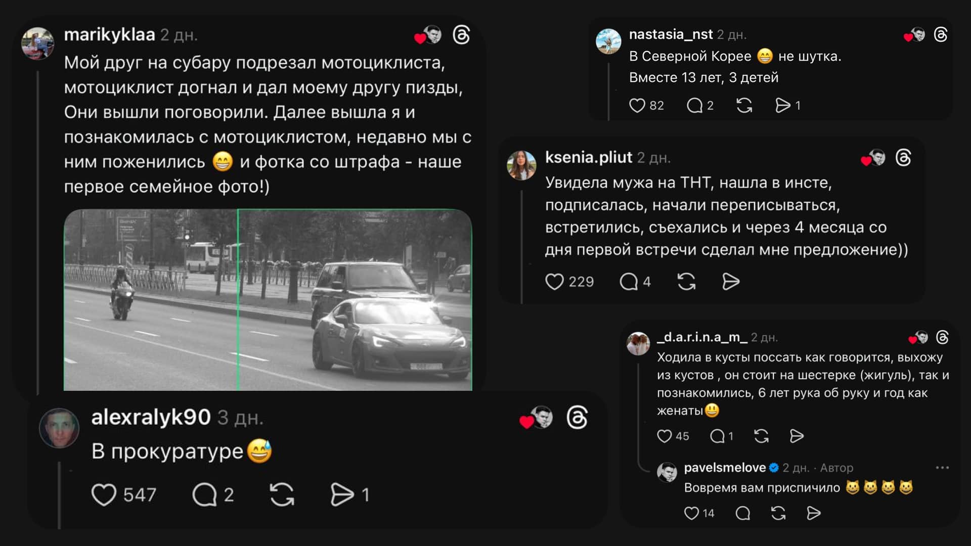 Одна из пользовательниц поделилась историей, начавшейся с дорожного конфликта. Ее друг на автомобиле подрезал мотоциклиста, что закончилось потасовкой. Девушка вышла из машины, чтобы вмешаться, и в итоге познакомилась с тем самым байкером. Сегодня они женаты, а их первое «семейное фото» – снимок с дорожной камеры, которая зафиксировала штраф в момент инцидента.