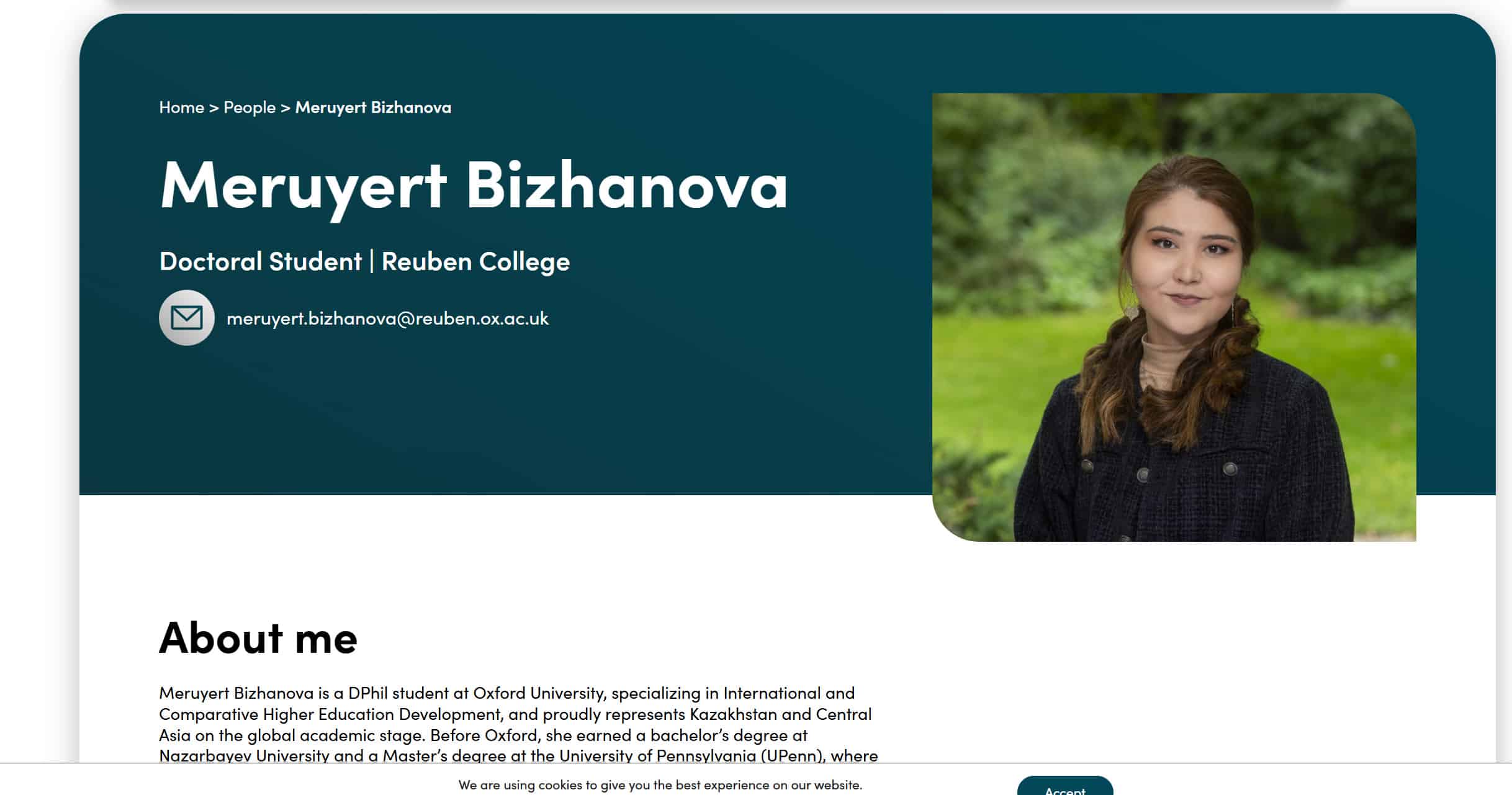 На сайте Оксфордского университета есть личная страничка Меруерт. В информации о ней отмечается, что она стала первой докторанткой из Казахстана и Центральной Азии в целом в своем департаменте. Чтобы попасть туда, ей пришлось выдержать конкуренцию с тысячами других кандидатов.