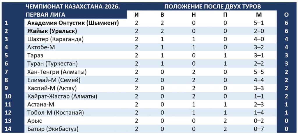 Уральский «Жайык» и «Академия Онтустик» из Шымкента, одержав по две победы, захватили лидерство в Первой лиге футбольного чемпионата Казахстана.