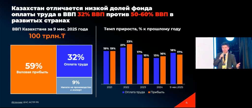 «Почему доходы населения падают?… Когда формируется ВВП, это стоимость товаров, произведенных внутри страны. Потом эта стоимость распределяется в первую очередь на оплату труда и прибыль компаний. Доля оплаты труда составляет всего 32%, а в развитых странах на оплату труда идет 50-60%», – сказал Кысыков в ходе форума AlinEX в Алматы.