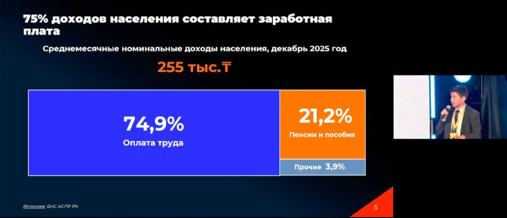 Средние номинальные доходы населения в Казахстане в декабре 2025 года составили 255 тыс. тенге. На оплату труда в общих доходах населения приходилось 74,9%, пенсий и пособий – 21,2%, прочих доходов – 3,9%.