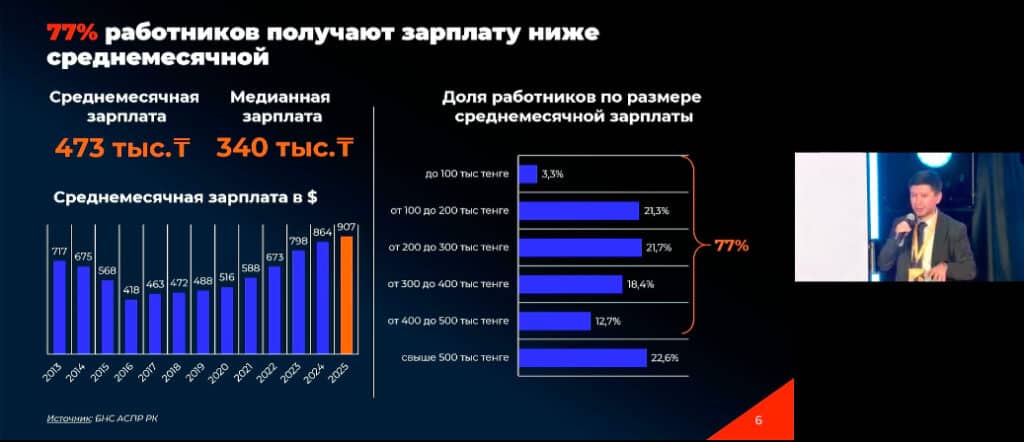 «Если вы читаете новости, то средняя зарплата в Казахстане составляет 473 тыс. тенге и многие люди в комментариях пишут, что нет таких зарплат и возмущаются. Почему так происходит? У нас очень серьезное неравенство в заработных платах – 77% работников получают зарплату ниже среднемесячной», – сообщил Кысыков.