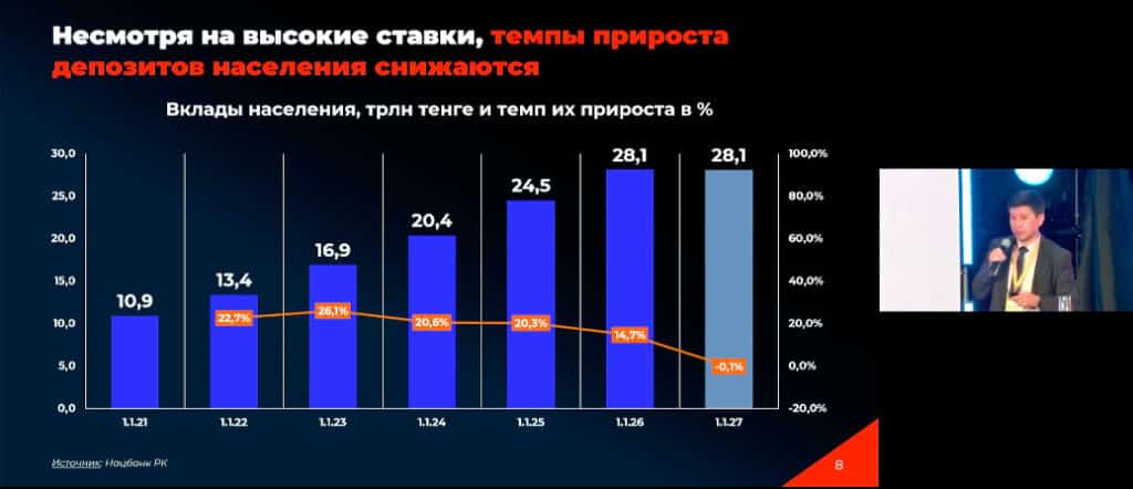 «Сами по себе депозиты копятся. Но именно в 2026 году мы наблюдаем, что сбережения населения на депозитах снижаются и люди стали меньше накапливать. То есть помимо проблемы закредитованности, о которой я говорил ранее, наблюдается падение сбережений и люди стали больше потреблять, но не физически, а в деньгах (брать рассрочки и так далее – Курсив)», – сказал он.