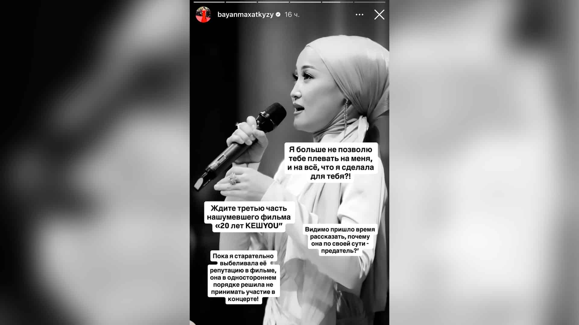 «Я больше не позволю тебе плевать на меня и на все, что я сделала для тебя! Видимо, пришло время рассказать, почему она по своей сути — предатель? Пока я старательно выбеливала ее репутацию в фильме, она в одностороннем порядке решила не принимать участия в концерте!», — заявила Баян Максаткызы.