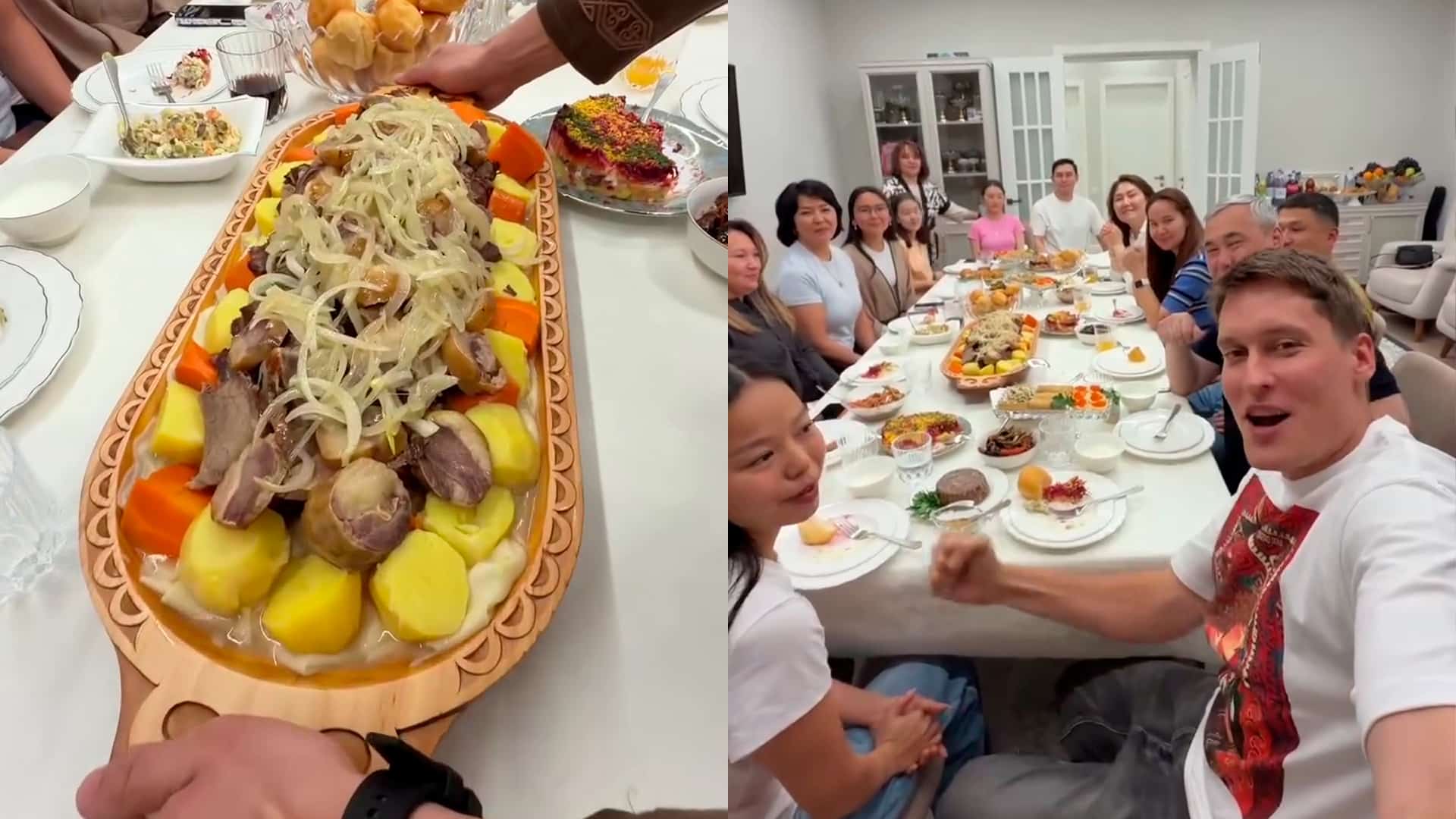 Видео в Instagram набрало десятки тысяч просмотров и сотни комментариев. Блогера пригласили «просто на ужин», но вместо обычного стола его ждал настоящий казахский дастархан с большим блюдом бешбармака. Хозяева дома встретили блогера в национальных костюмах и с шашу, сразу задав атмосферу праздника.