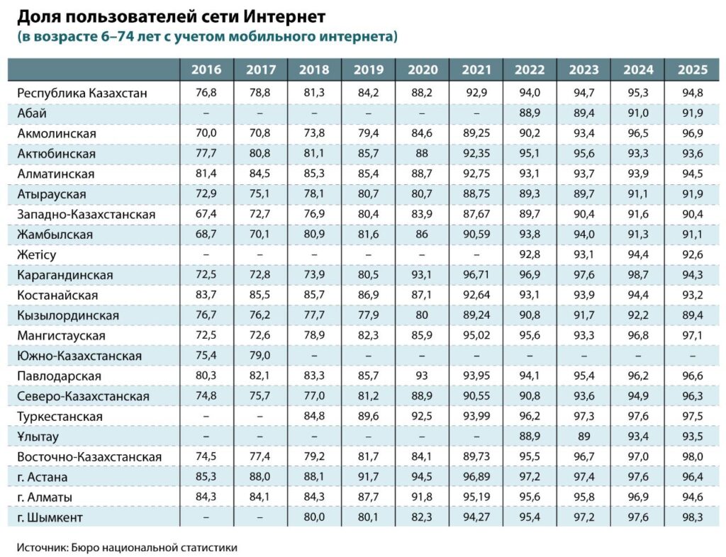 За последнее десятилетие digital-рынок Казахстана миновал стадию активного роста, достигнув определенной зрелости. По данным Бюро национальной статистики, интернет-проникновение увеличилось на 22% и в 2025 году достигло порядка 95%. Теперь развитие рынка идет не за счет новых пользователей, а благодаря качеству предоставляемых услуг и внедрению новых технологий.
