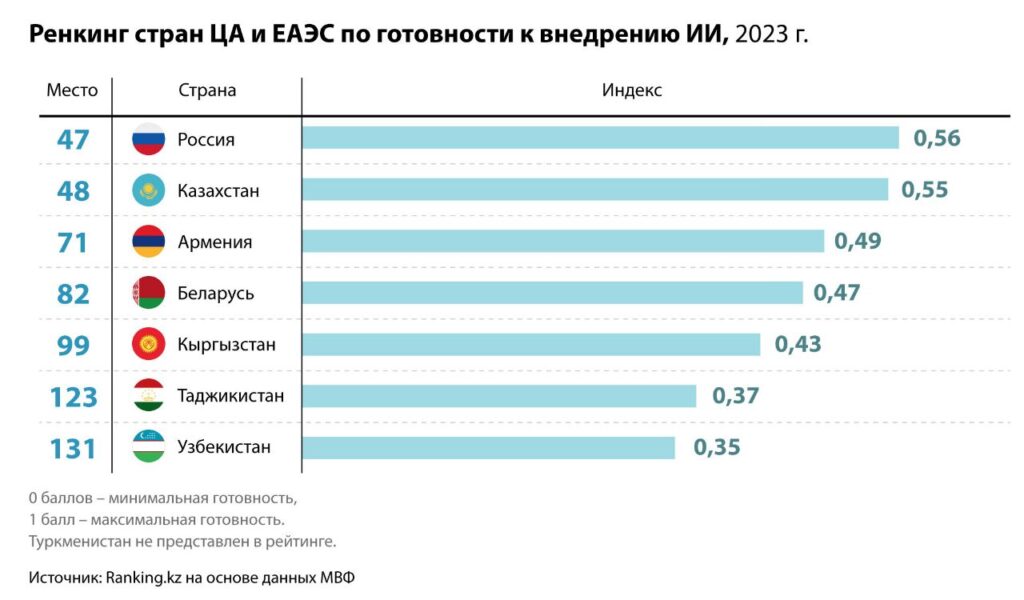 Успехи страны подтверждаются и на мировом уровне: согласно данным МВФ, в 2023 году в Глобальном индексе готовности к ИИ (IAPI), охватывавшем 174 страны, Казахстан занимал 48-ю строчку.