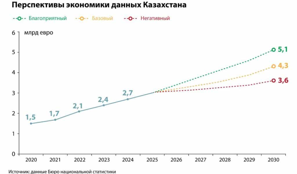 Эксперты отмечают: «Особенно актуальным становится формирование устойчивой, прозрачной и сбалансированной экосистемы обмена и использования данных, в которой были бы учтены интересы всех участников: потребителей, провайдеров и субъектов данных. Развитие таких механизмов становится необходимым условием для масштабного внедрения ИИ и раскрытия его экономического потенциала. Использование данных оказывает мультипликативный эффект на экономику, стимулируя общий рост и способствуя формированию полноценной экономики данных. По оценкам IDC, объем экономики данных в Казахстане в 2024 году составил 2,7 млрд евро. Согласно базовому сценарию, к 2030 году он увеличится в 1,6 раза и превысит 4,3 млрд евро. В случае реализации сценария высокого роста – в 1,9 раза, до 5,1 млрд евро. При этом исследование IDC также показывает, что в сравнении со странами ЕС рынок данных Казахстана находится на этапе становления. Так, если в Казахстане доля экономики данных к ВВП по итогам 2023 года составлила 1,3%, то в странах ЕС этот показатель достиг 5%. Кроме того, в отличие от ЕС казахстанские компании практически не экспортируют данные и дата-продукты. Это является одной из потенциальных зон для дальнейшего роста, учитывая зрелость казахстанского IT-рынка».