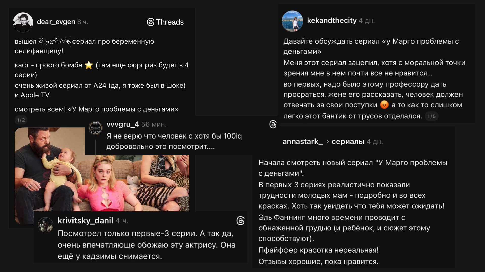 В соцсетях сериал разделил аудиторию. Одни пишут, что проект получился живым и честным в изображении материнства, другие критикуют его за излишнюю откровенность и спорные решения героини. Отдельно зрители обсуждают актерскую игру, многие отмечают, что Фаннинг убедительно смотрится в непривычном для себя образе молодой матери.