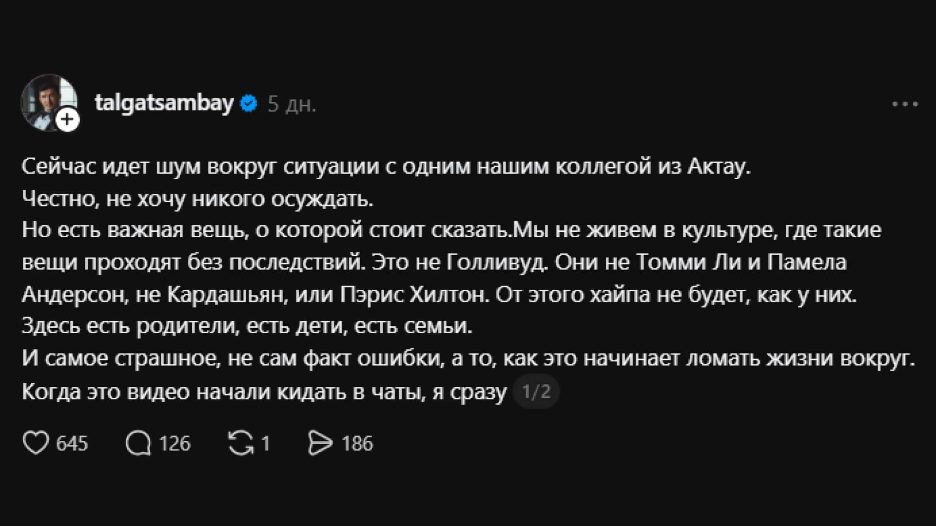«Быть причичной такого распространения – это уже ответственность на нас. Больше всего жалко не их самих. Жалко их родителей. Жалко детей», – пишет популярный блогер и ведущий Талгат Самбай и призывает не открывать ссылки на видео.