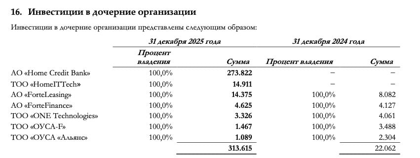 В том же ноябре 2025 года ForteBank приобрел 100% акций HomeITTech, которая занимается разработкой и поддержкой программного обеспечения для банка. Инвестиции в эту компанию составили, согласно отчету, 14,9 млрд тенге