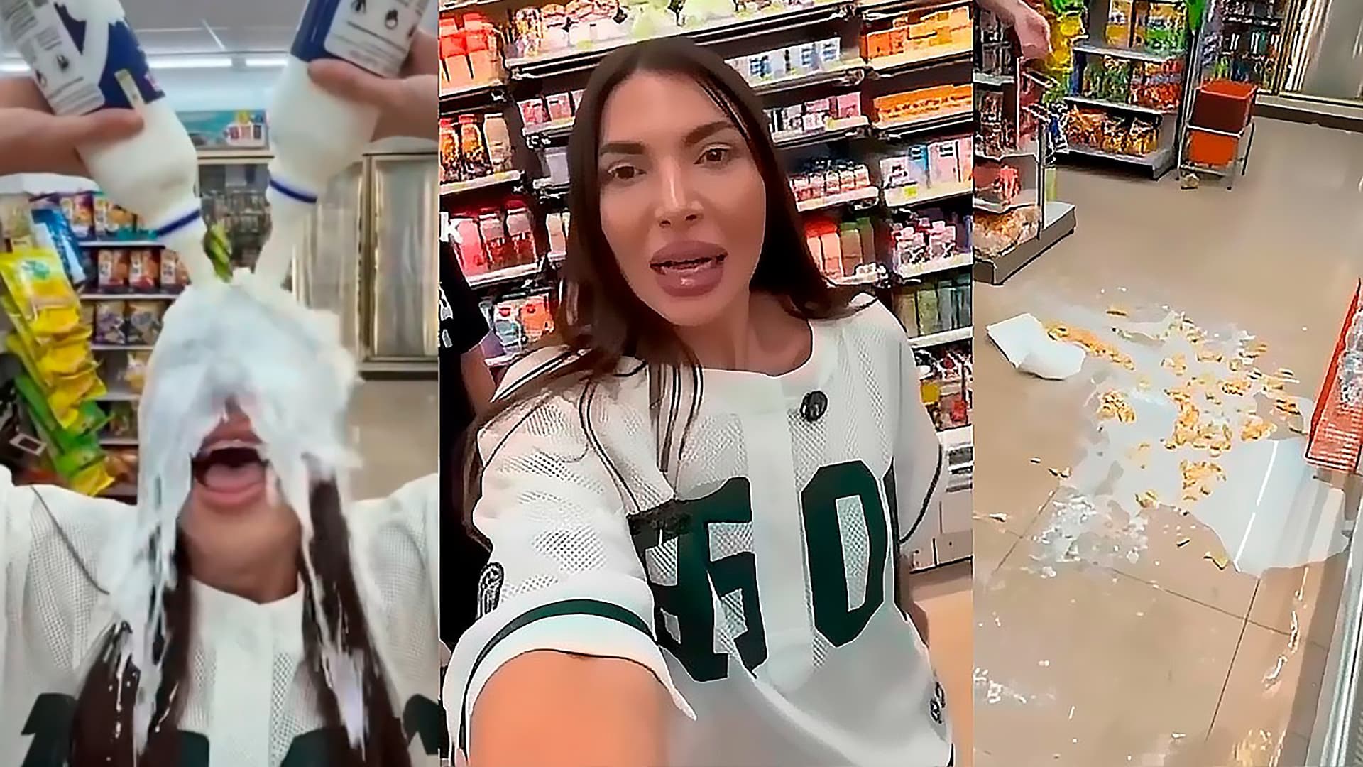 На кадрах видно, как она выливает на себя молоко, рассыпает чипсы и устраивает беспорядок в торговом зале. Все это сопровождается криками о том, что в Казахстане нужно открыть магазины 7-Eleven.
