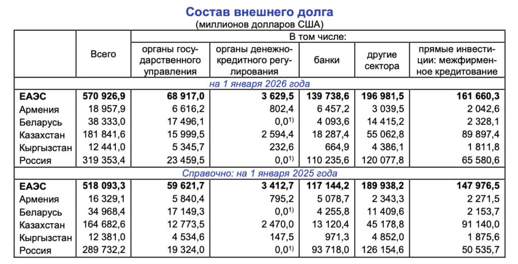 В результате совокупный внешний долг ЕАЭС на начало 2026 года вырос на $52,8 млрд, или на 10,2% – до $570,9 млрд. Наибольший абсолютный прирост пришелся на Россию – на $29,6 млрд – до $319,3 млрд.