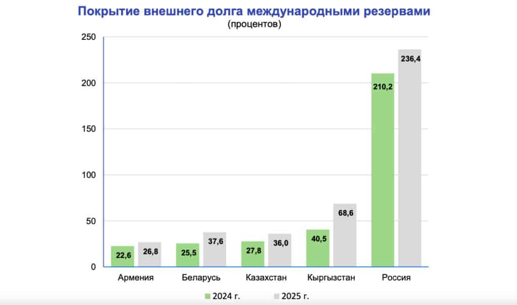Самое высокое покрытие внешнего долга международными резервами наблюдается в России (236,4%). В других странах этот показатель составлял от 26,8% в Армении до 68,6% в Кыргызстане.