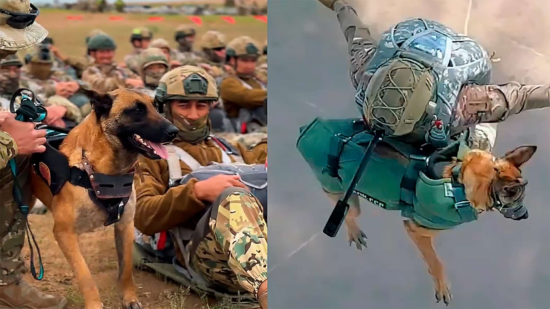 На кадрах видно, как служебную собаку фиксируют в специальной экипировке перед прыжком. После этого она вместе с военнослужащими десантируется с высоты. Судя по ролику, животное ведет себя спокойно, а приземление проходит штатно.
