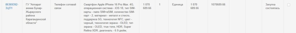 Аппарат акима Бухар-Жырауского района Карагандинской области в апреле разместил на портале госзакупок объявление о приобретении основных средств. В списке желаемого оказался полноценный мобильный съемочный комплект и iPhone 16 Pro Max за 1 070 689 тенге.