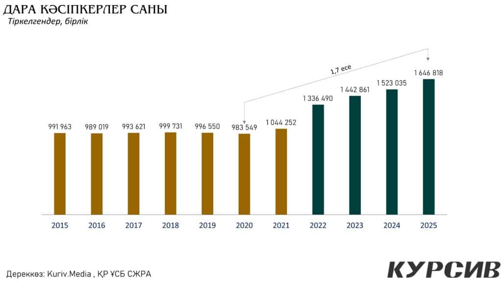 Яғни 2020–2025 жылдары дара кәсіпкерлер саны 1,7 есеге өсті. Бұл – тек сан емес, экономиканың бейімделу қабілетінің көрсеткіші.