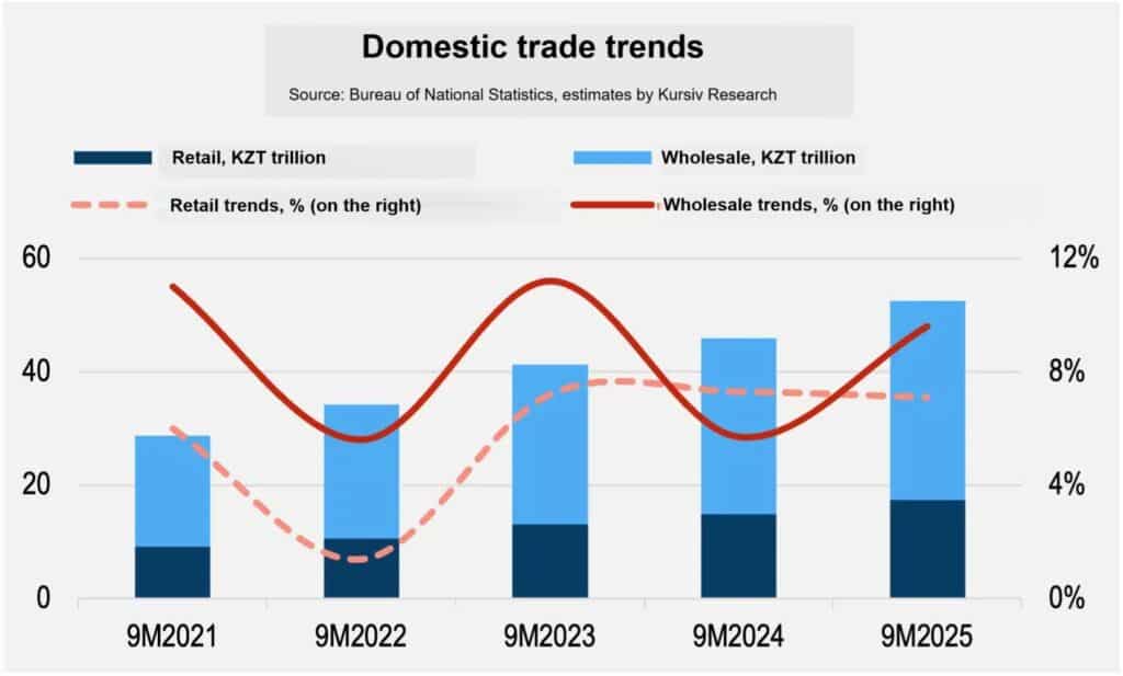 Between January and September 2025, Kazakhstan’s domestic trade grew 8.8%, driving economic growth along with transportation and warehousing (up 21.2%), construction (up 14.9%) and industry (up 7.4%).