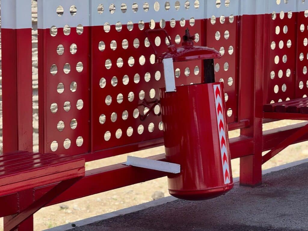 The bus stop, located next to Fire Station No. 4, showcases impressive attention to detail: the trash can is fashioned from a 50-liter extinguisher, and the lamps are made from smaller five-liter ones.