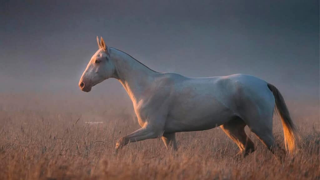 The Akhal-Teke’s coloring is especially striking. While bays, blacks, duns, and chestnuts are most common, rarer shades such as gray, palomino, and isabella (a creamy golden hue) are highly prized for their luminous shine.