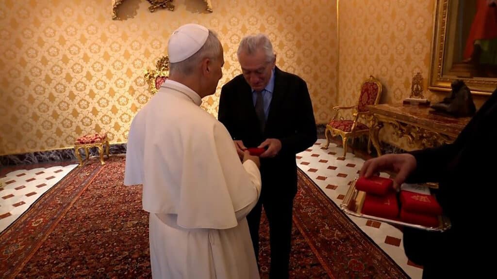 Alongside De Niro, five others were present at the audience. When the meeting concluded, the pope had small red and white gift boxes brought in on a tray and presented one to each guest.