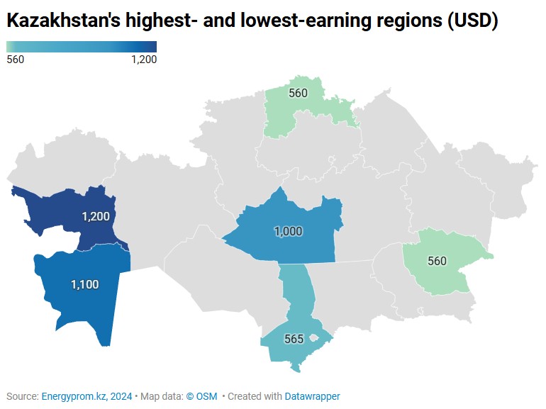 At the bottom of the ranking were the North Kazakhstan, Zhetysu, and Turkestan regions, each averaging just over $560.