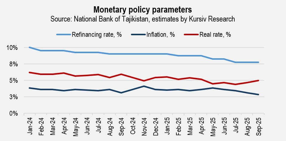The easing inflation environment allowed the National Bank of Tajikistan to loosen monetary policy. In July 2025, the central bank cut the refinancing rate by 50 basis points, bringing it to 7.75%.