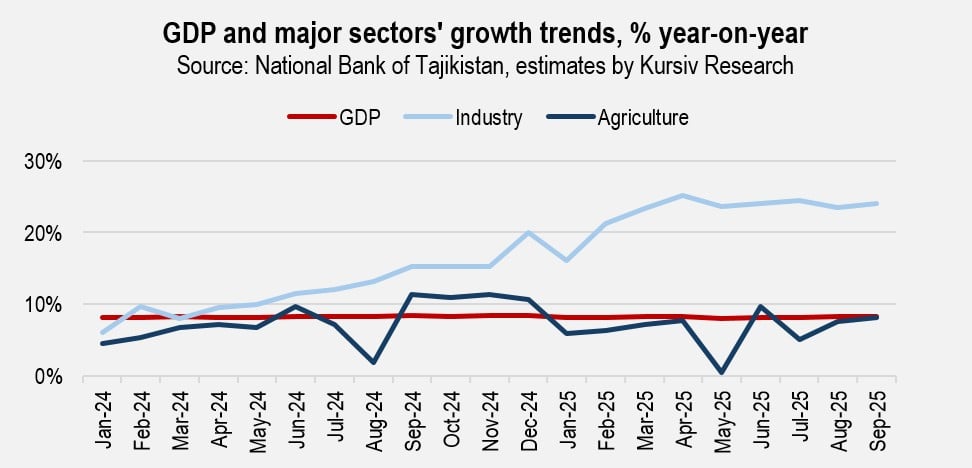 In 2024, Tajikistan’s economy grew 8.4%. Despite global economic uncertainty, rising geopolitical tensions, and escalating trade disputes, the country’s GDP expanded 8.2% in the first nine months of 2025, reaching 117.8 billion somoni (about $12.7 billion). The government expects this pace to hold through the end of 2025 before accelerating to 8.5% in 2026. The World Bank forecasts 7.6% growth in 2025, while the IMF and EBRD project 7.5%.