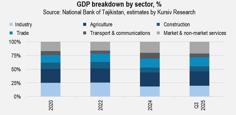 Despite strong industrial output, the sector’s share of GDP is not rising. Using 2020 as a baseline, industrial production grew 235% and agriculture 150%, while the broader economy grew 149%. However, according to the National Bank of Tajikistan, the share of industrial gross value added fell from 23.1% in 2020 to 17.7% in the first nine months of 2025. This discrepancy raises concerns about the reliability of national statistics.