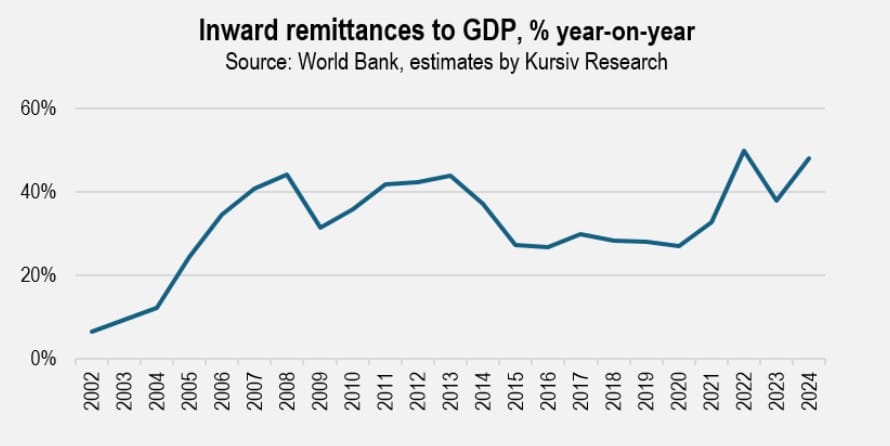 In 2024, remittances rose more than 45%, reaching 47.9% of the country’s GDP. According to a World Bank study, more than 90% of Tajik migrants work in Russia. Labor shortages in Russia, rising wages, and a stronger ruble all contributed to the sharp increase in remittance inflows.