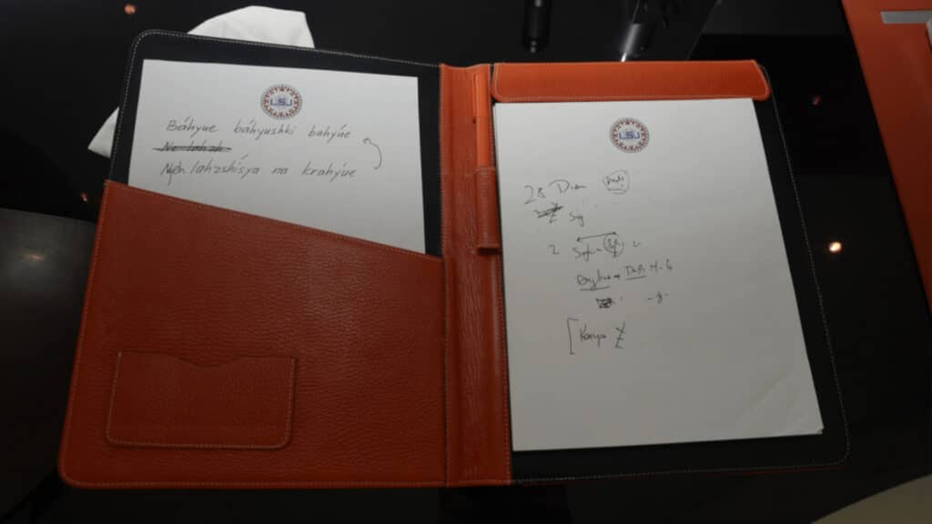 Inside the notebook’s left flap is a sheet of white paper containing the transliterated lyrics of a Russian lullaby: «Bahyue bahyushki bahyue, Nieh lahzshisya na krahyue,» which translates as, «Rock-a-bye, baby, don’t lie so near the edge.»