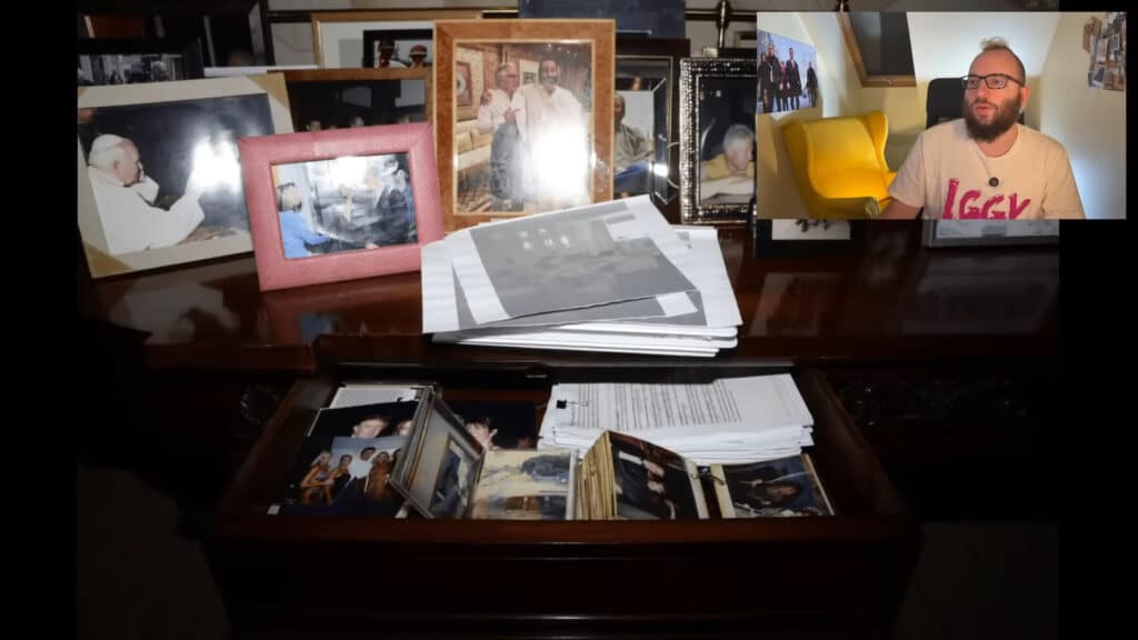 The image shows a table with drawers, framed memorabilia on top — including a photograph of the late Pope John Paul II — and photo albums inside a central pull-out drawer. The albums contain numerous photographs of Donald Trump, including one image showing him surrounded by women in swimsuits.