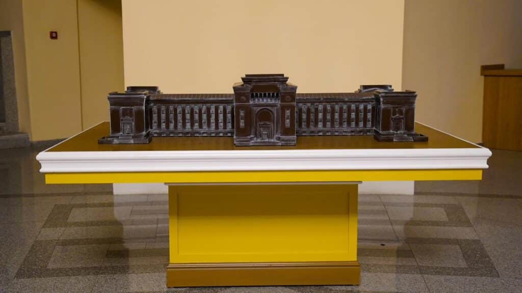 Some models have been placed in front of entrances, while others are located inside the buildings. They were created using modern 3D printing technology.