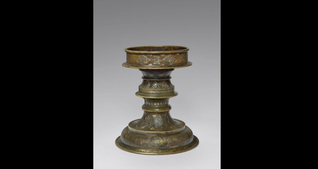 According to the museum’s catalog, the artifact (inventory No. OA 7079) dates to 1396-1397 and originates from the Yasawi mausoleum. It is made of cast bronze with engraving and gold and silver inlay. The Louvre’s records indicate it was offered to the museum in November 1916, though they do not explain how it left the mausoleum.